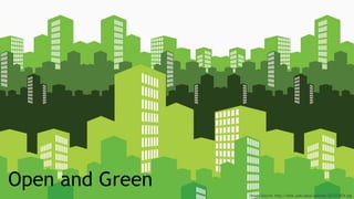 The document envisions cities of the future becoming more pedestrian-focused, green, and sustainable. Superblocks will minimize cars and maximize walking, biking, and public transport like driverless vehicles and subways. This approach revitalizes local economies by getting more people out of their cars and into public spaces. Cities will also generate more renewable energy through solar, green roofs, and sustainable water management. Workplaces will decentralize into hubs while many people work remotely. As global talent is attracted to dynamic city economies, urban centers will deepen cultural diversity and connections worldwide.