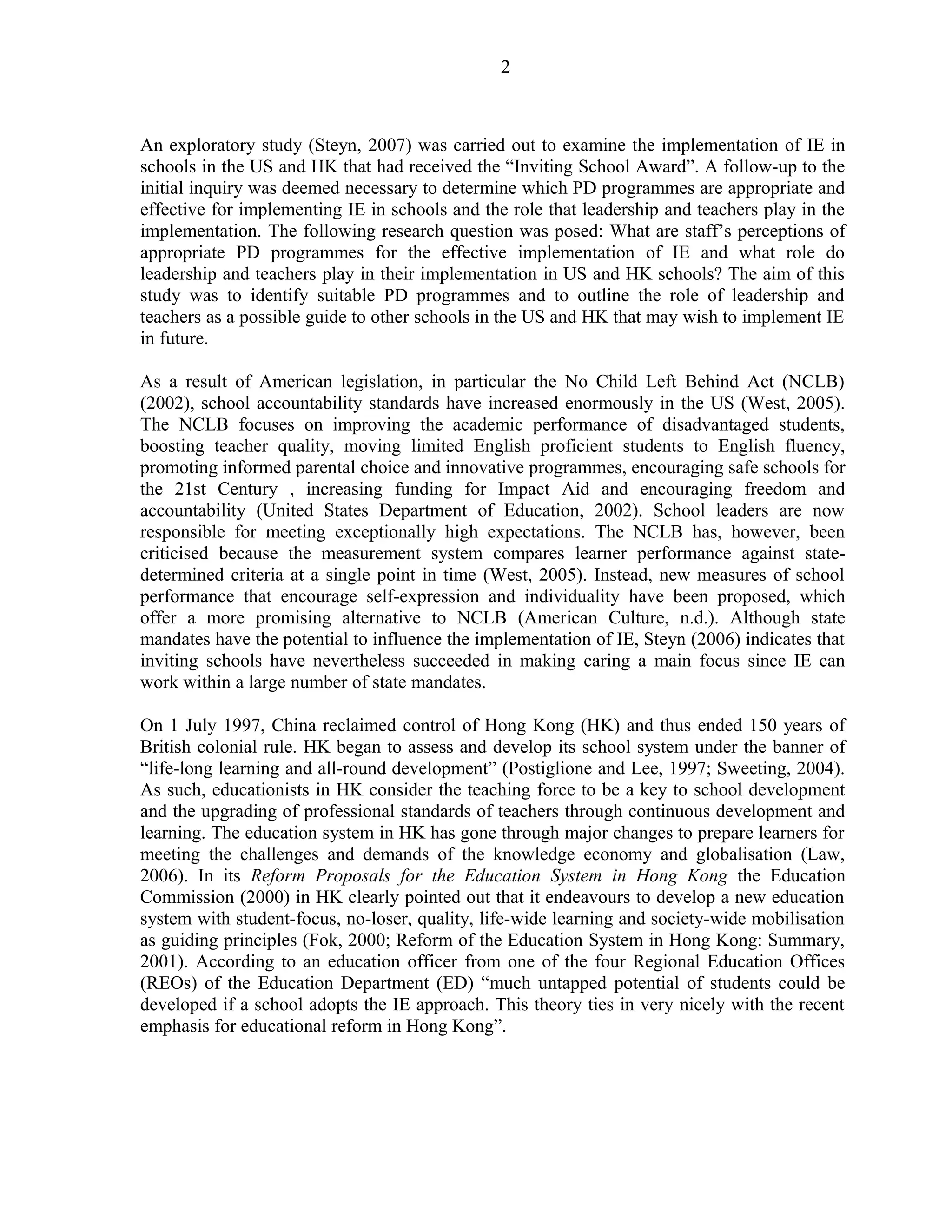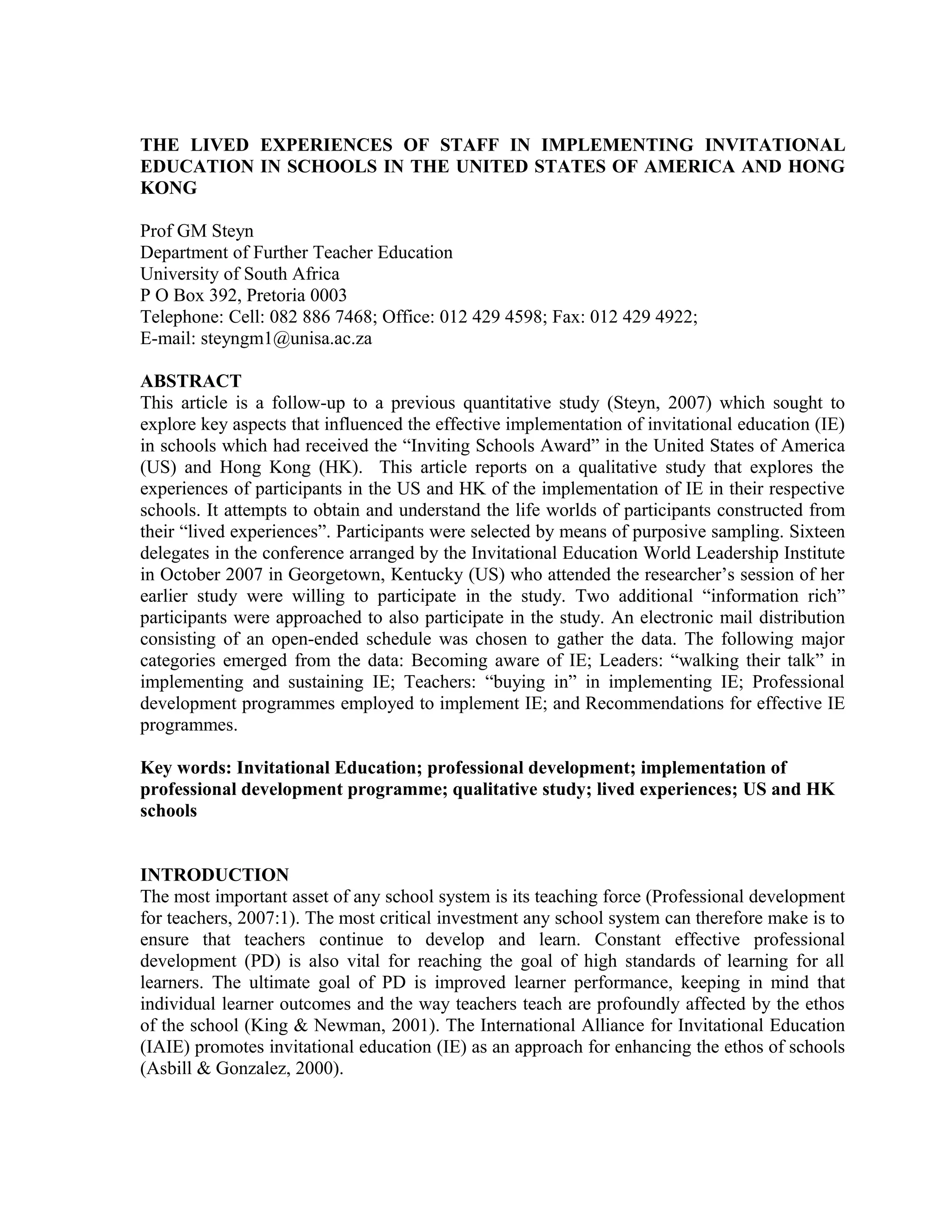 This document summarizes a study that explored the lived experiences of staff in implementing Invitational Education (IE) in schools in the United States and Hong Kong. The study collected data through an open-ended electronic survey of 18 participants who had experience implementing IE in their schools. The survey explored effective professional development programs for IE implementation and the role of leadership and teachers. The major findings that emerged were: 1) effective IE implementation requires leaders who model IE principles and support ongoing professional development, 2) teachers must be committed to IE and view professional development favorably for implementation to succeed, and 3) professional development on IE should involve long-term learning programs with active participation and support from school leadership.