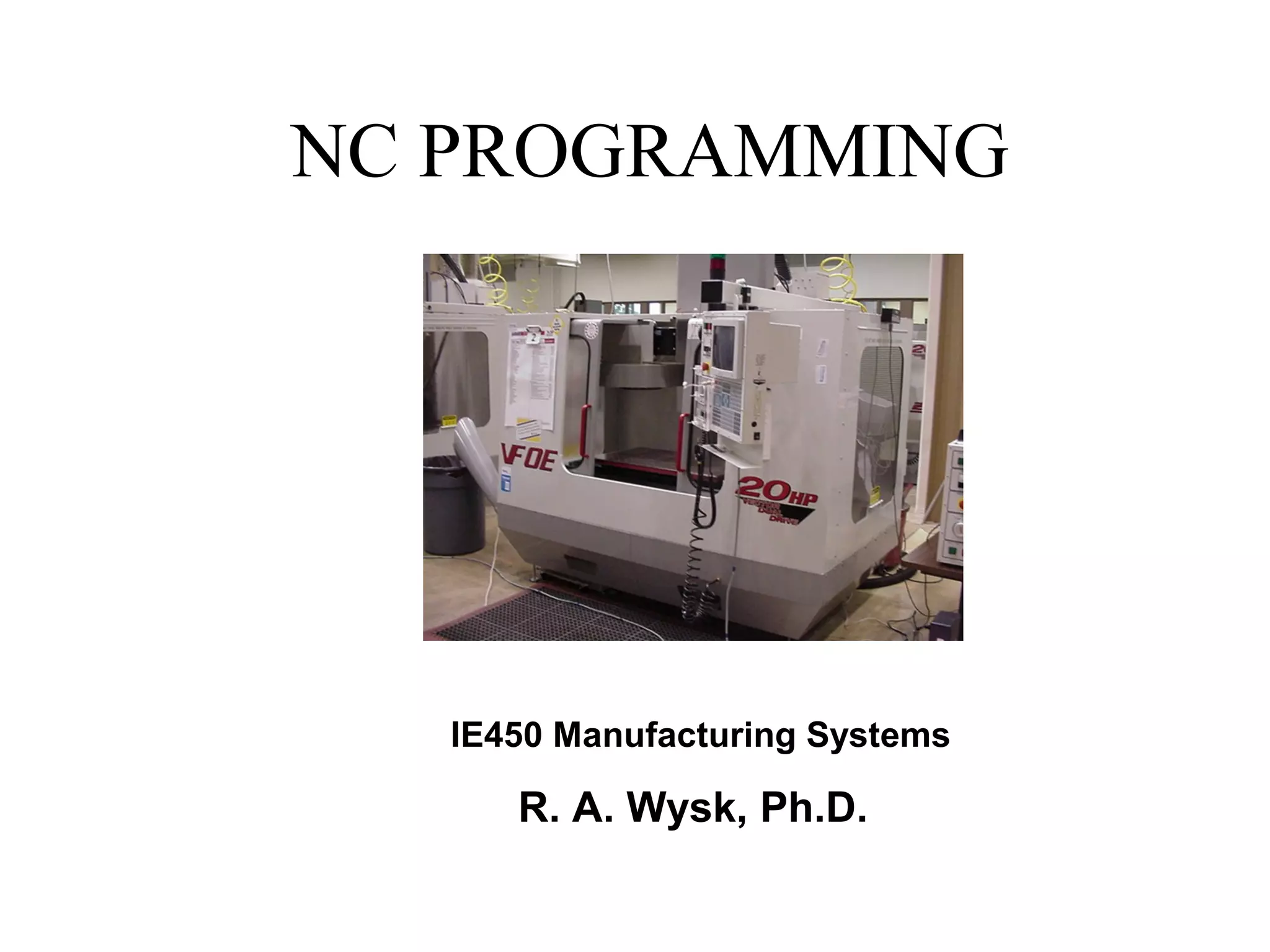This document provides an overview of NC programming for a manufacturing systems course. It discusses the agenda which includes types of NC machines, components, control mechanisms, interpolation, and software. The objectives are to understand NC part programs, machine coordinates, and executing NC programs. It also summarizes different types of NC machines like machining centers and turning centers, their components, and control systems.