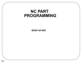 The document provides information on numerical control (NC) and computer numerical control (CNC) machines. It discusses the historical development of NC machines and how they have evolved from mechanized production equipment using cams and stops to programmable automation using NC, PLC and robotics. It then describes the major components, motion control, classifications and accuracy/repeatability of modern NC machines. The document also covers point-to-point and continuous path control, interpolation methods, programming codes and tool compensation techniques for NC machines.