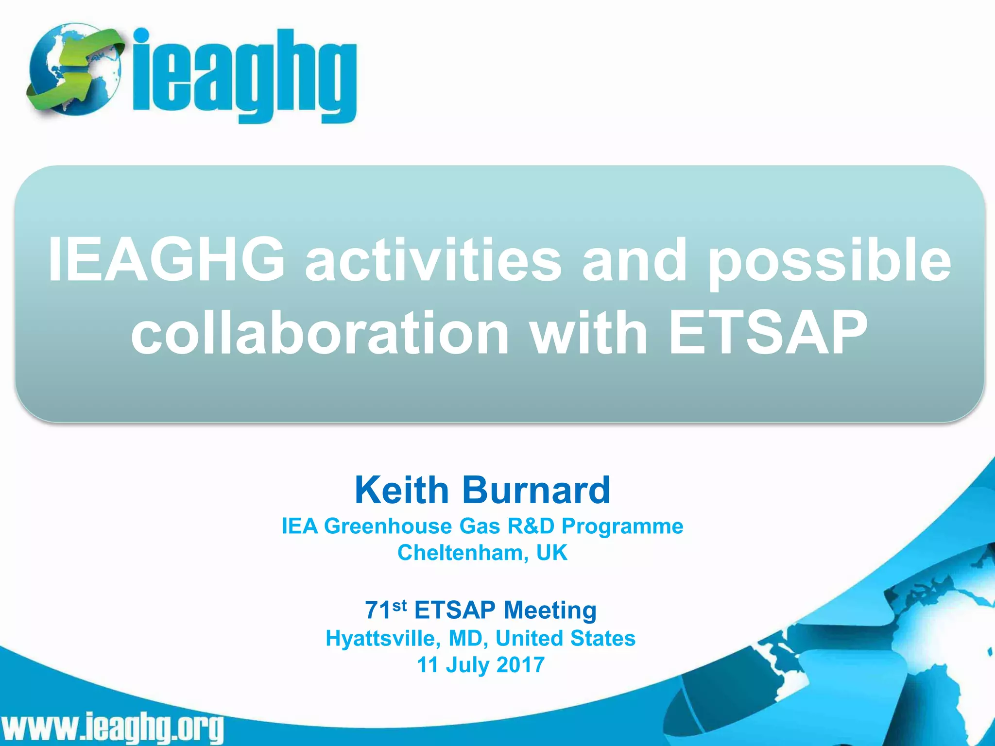 This document summarizes a presentation given by Keith Burnard from the IEA Greenhouse Gas R&D Programme (IEAGHG) at the 71st ETSAP Meeting. The IEAGHG assesses mitigation technologies like carbon capture and storage (CCS), tracks their development and costs, and provides independent technical input to members and policymakers. The document reviews key findings from reports like the IPCC's Fifth Assessment Report and IEA scenarios that show the important role of CCS in limiting warming to well below 2°C, as well as progress and challenges for deploying CCS at commercial scale. Areas for potential cooperation between IEAGHG and ETSAP are discussed.