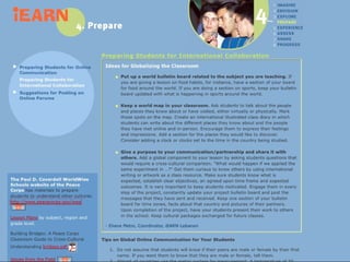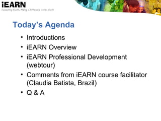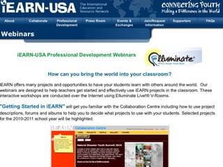 The document provides an overview of the International Education and Resource Network (iEARN). It discusses iEARN's history, goals, and methods. Specifically, it notes that iEARN was founded in 1988 and connects over 2 million K-12 students and educators from 130 countries through online collaborative projects. It aims to facilitate student-directed projects, support structures for this work, and demonstrate how online education can enhance learning globally. Key aspects include online courses for educators, professional development workshops, and annual international conferences.