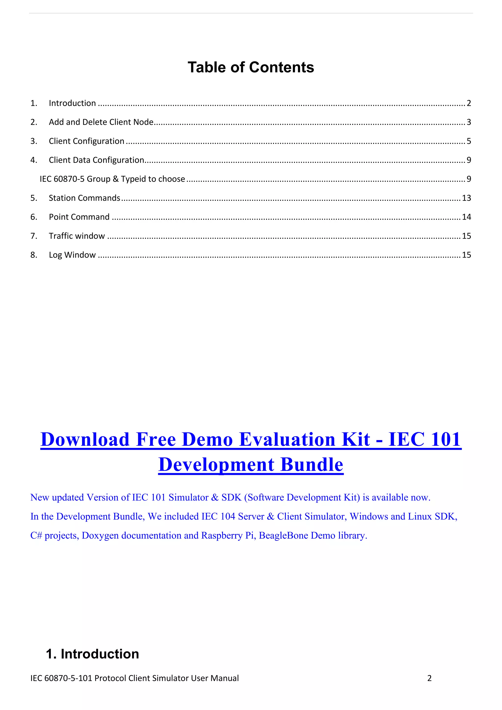 The IEC 60870-5-101 Protocol Client Master Simulator User Manual provides detailed instructions on configuring and using the client simulator, which is designed for power system monitoring and control in compliance with the IEC standards. Features include the ability to add up to 50 independent client nodes, support for different data transfer modes, and various configuration parameters for data transmission and station commands. The manual also outlines tools for monitoring communication traffic and logging command exchanges between the master and server.