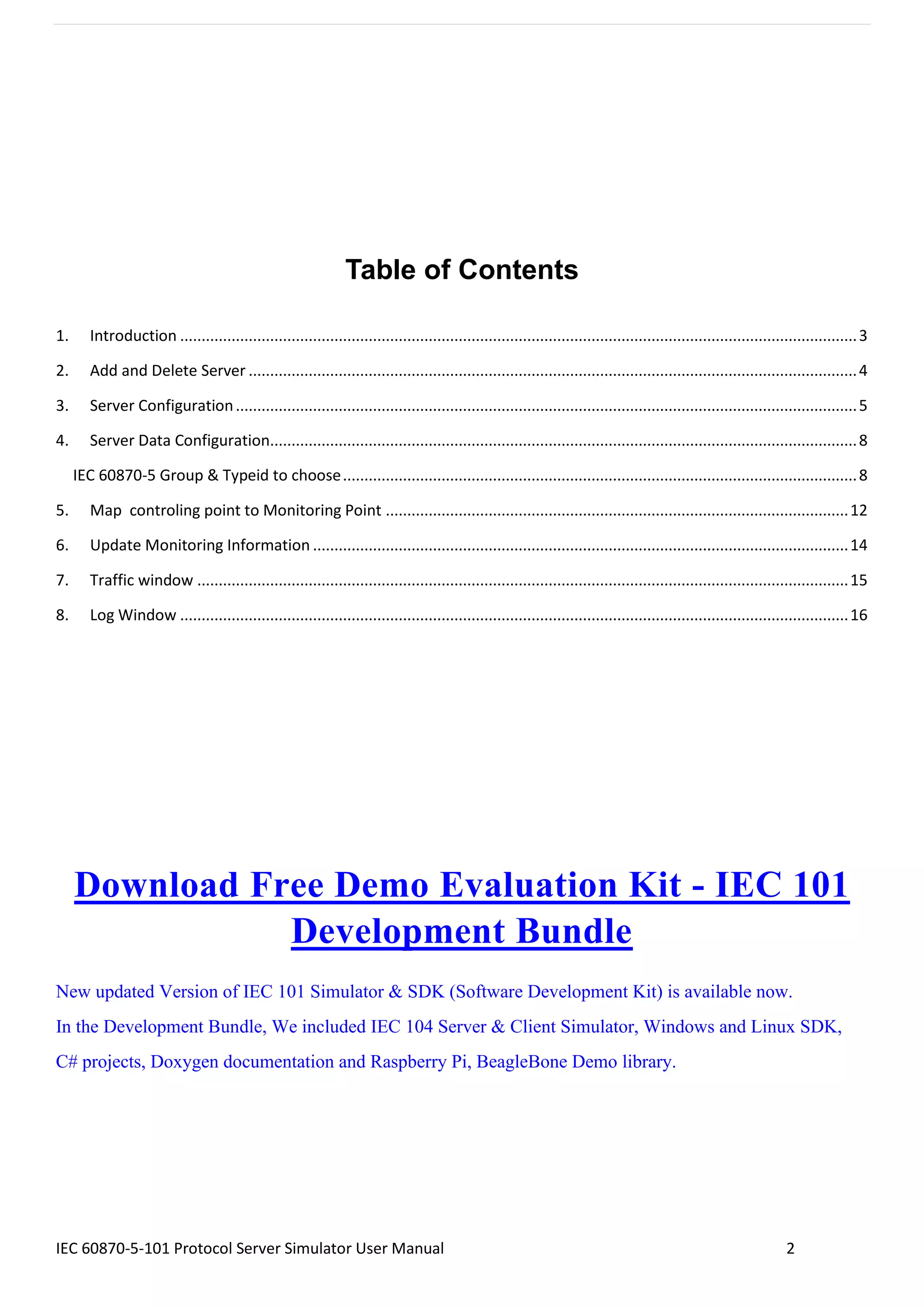 The IEC 60870-5-101 Protocol RTU IED Server Simulator User Manual provides comprehensive guidance on configuring and using the simulator for power system monitoring and control. It details server setup, data configuration, features of the protocol, and methods for mapping control points to monitoring points. Additionally, it contains instructions for managing server nodes and monitoring communication traffic.