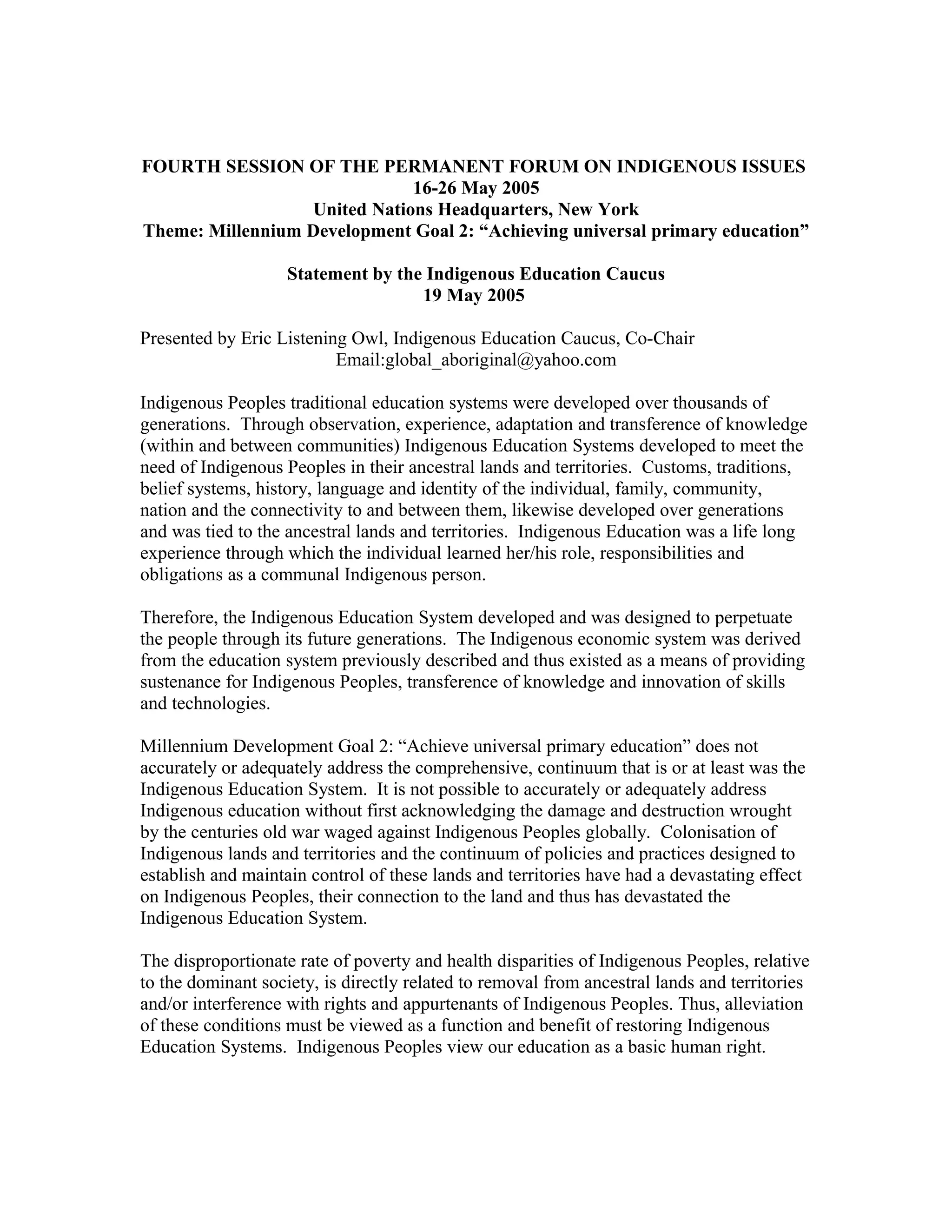 The document discusses indigenous education systems and issues with achieving Millennium Development Goal 2 of universal primary education. It notes that indigenous education systems developed over thousands of years and were tied to ancestral lands. Colonization has damaged these systems and connection to land. It recommends that the UN recognize the right to ancestral lands, declare indigenous peoples in a state of emergency, and support community-led mother-tongue education that preserves indigenous languages and culture.