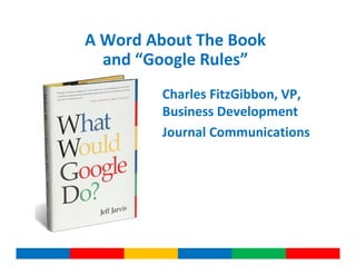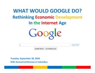 The document summarizes key rules for economic development organizations in the Internet age according to Google's principles and strategies. It discusses the importance of search engine optimization and social media presence to build "Google juice"; leveraging networks and partnerships rather than relying on middlemen; providing instant answers to common customer questions online; and using customer feedback to inform marketing strategies. Presenters from various economic development consulting and marketing firms provided examples and advice for applying these "Google rules" effectively.
