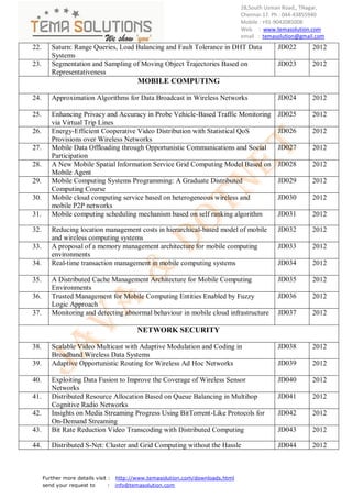 This document provides a list of 61 projects related to cloud computing, knowledge and data engineering, mobile computing, network security, network routing, and network attack and induction detection. Each project is given a project title, code, and year. Additional details on the projects can be found by visiting the provided website or by sending a request to the given email address.