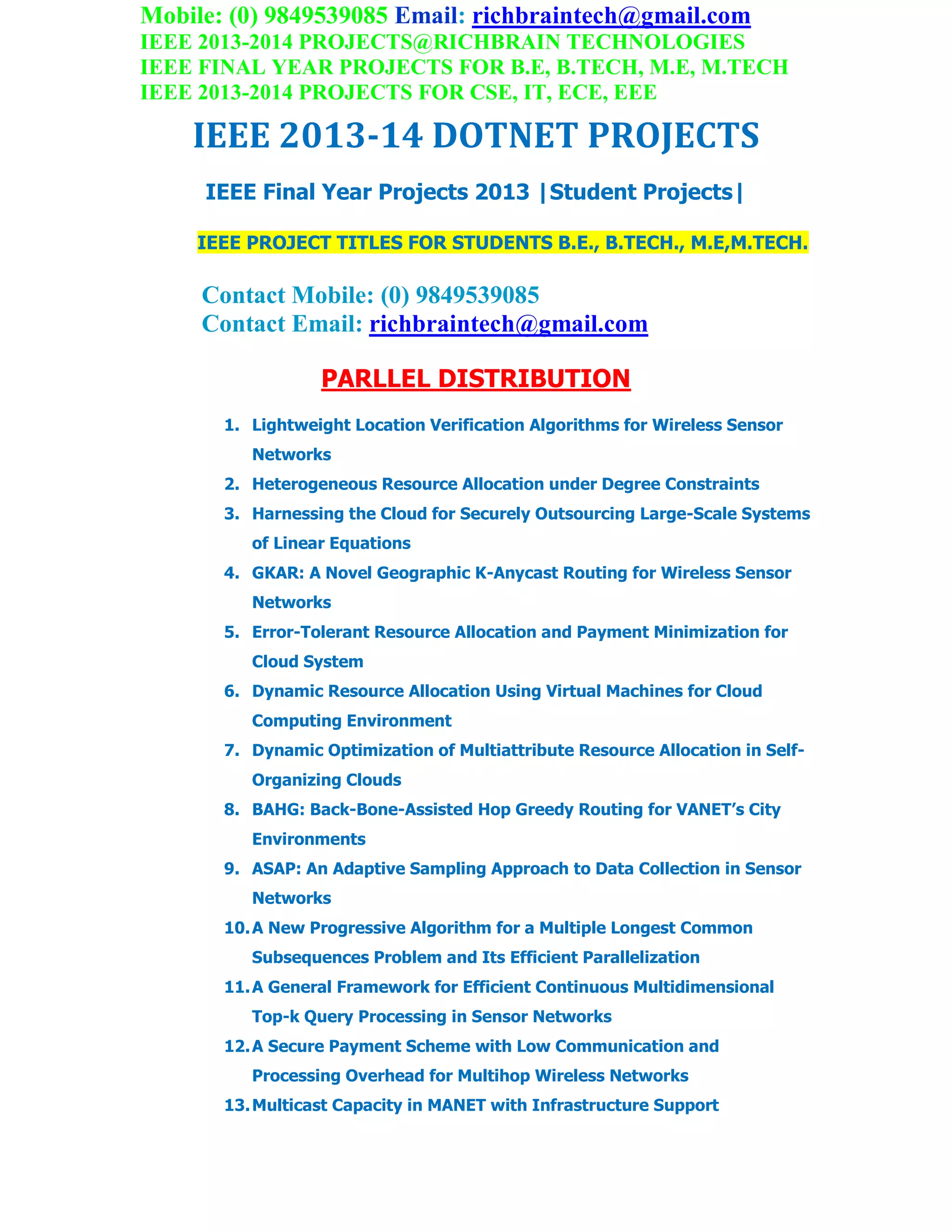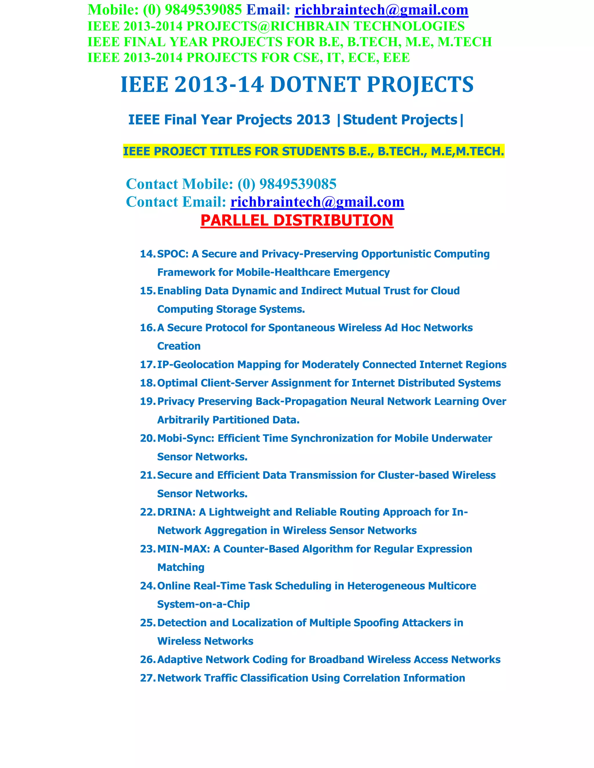 This document lists contact information and IEEE project titles from Richbrain Technologies. It provides titles for 38 IEEE projects related to mobile computing, ranging from efficient rekeying frameworks for secure multicast with mobile users to adaptive position update for geographic routing in mobile ad hoc networks. Contact details are provided to obtain more information about the IEEE projects.