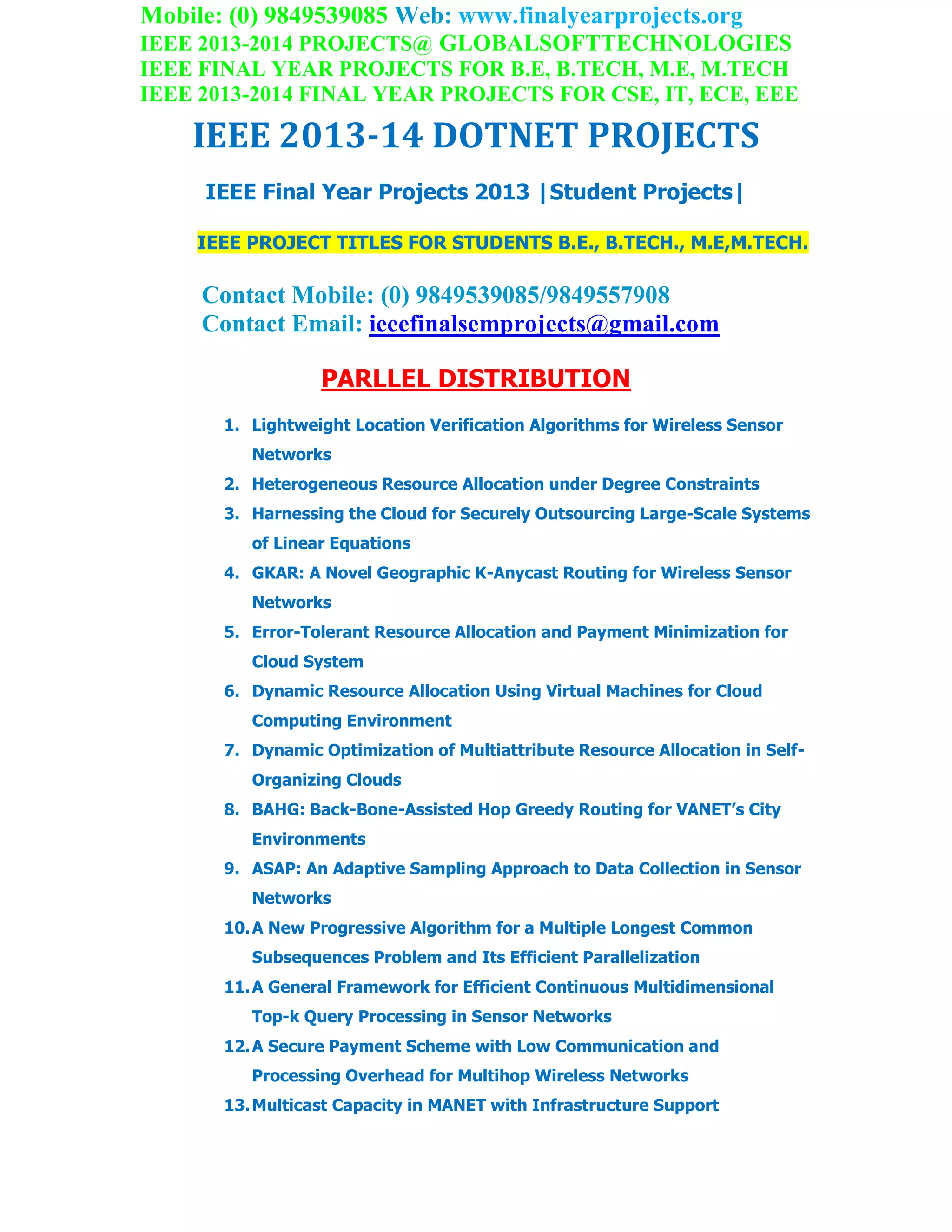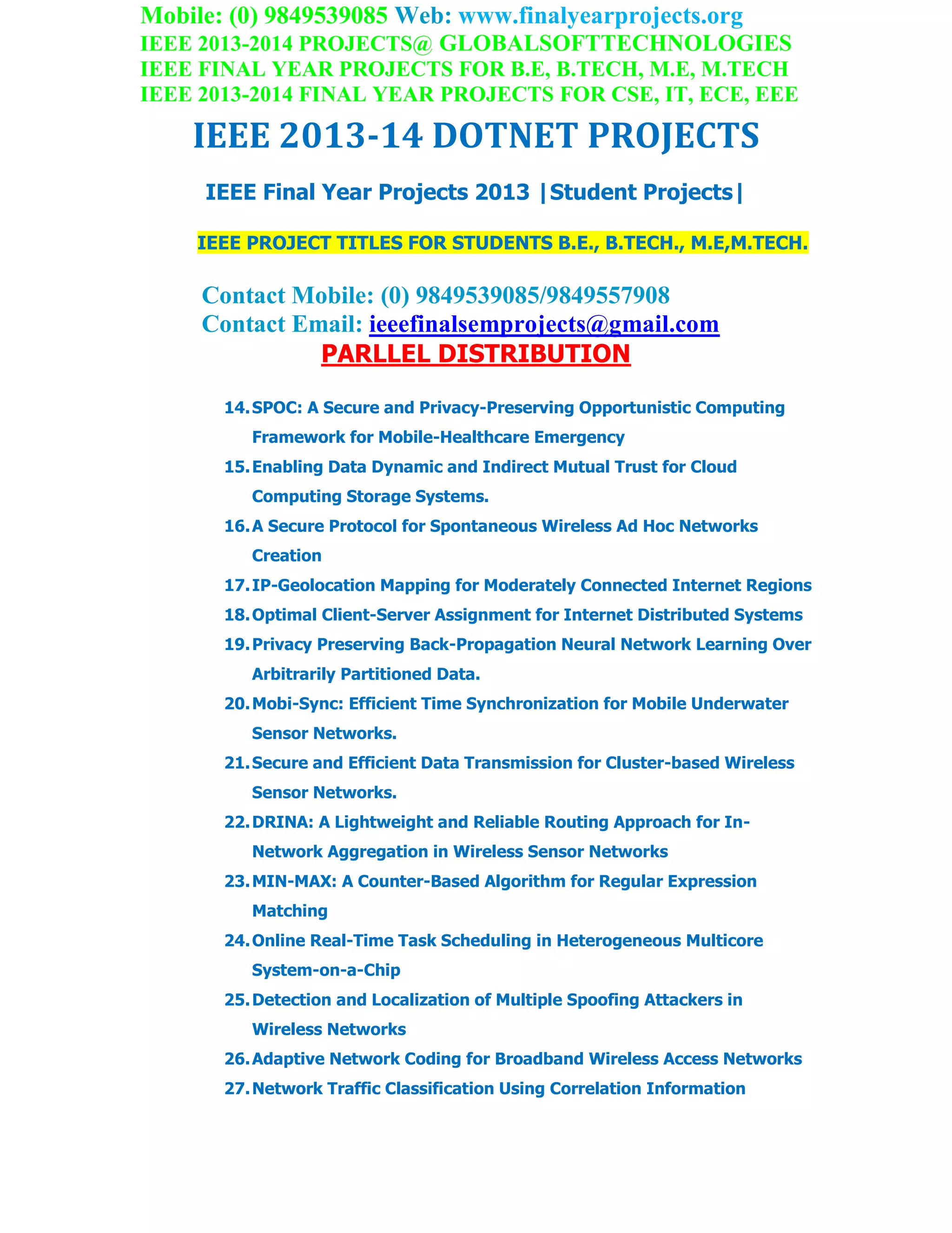 The document outlines a variety of IEEE final year project titles for engineering students, specifically for B.E, B.Tech, M.E, and M.Tech disciplines for the academic years 2013-2014. It covers multiple areas, including cloud computing, data mining, and wireless sensor networks, with a focus on innovative topics such as secure data transmission, resource allocation, and privacy-preserving techniques. Contact information, including mobile numbers and an email address for inquiries, is also provided.