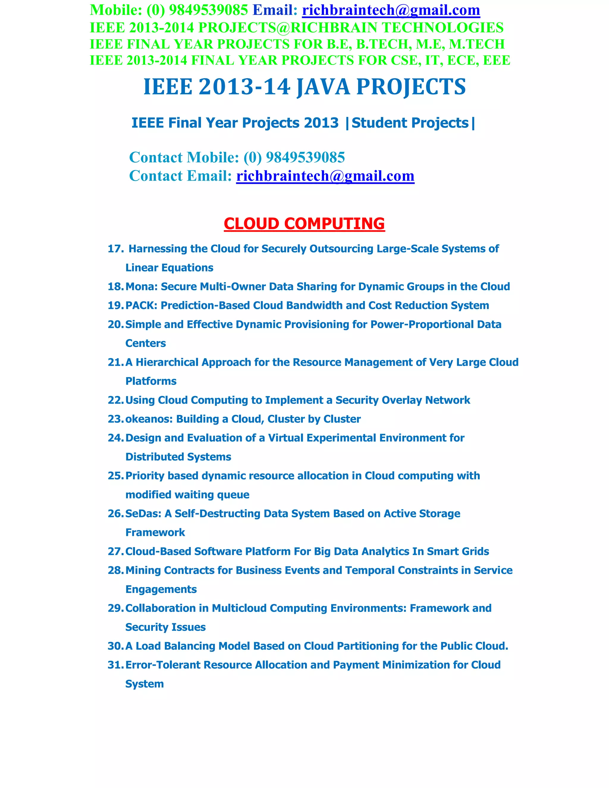 This document lists over 50 IEEE final year projects from various domains including cloud computing, data mining, parallel distribution, and mobile computing. It provides contact information for Richbrain Technologies, which offers these projects. Titles and brief descriptions of projects in each domain are provided.