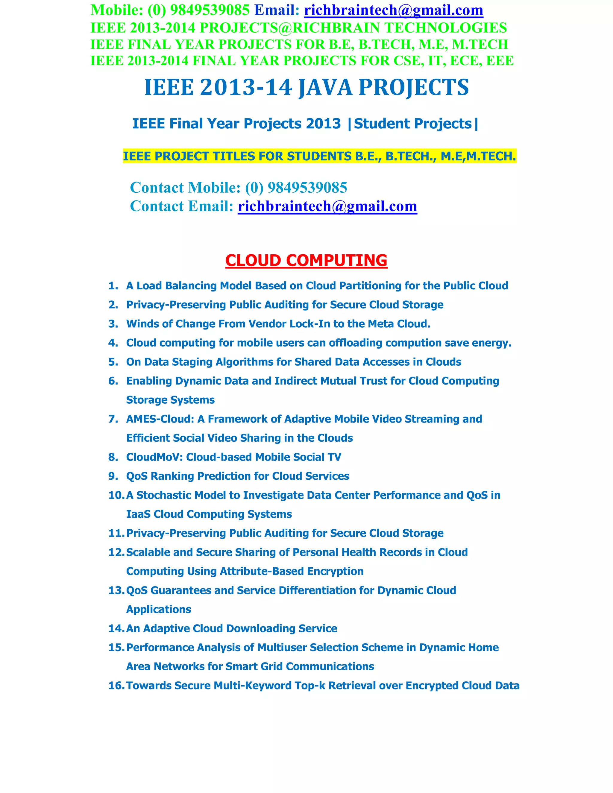 The document lists contact information for Richbrain Technologies and describes that they provide IEEE final year projects for students in various disciplines such as computer science, information technology, electronics and communication engineering. It then lists over 45 potential project titles related to cloud computing and data mining that students can select for their final year projects.