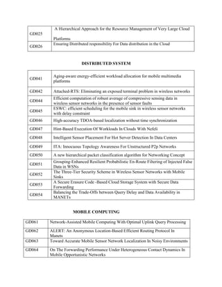 The document outlines various IEEE 2013 projects related to data mining, cloud computing, mobile computing, networking, network security, and software engineering. Each project is identified by a unique code and addresses specific challenges and innovations, ranging from customer churn prediction models to security measures in cloud architectures and efficient routing protocols in mobile networks. The projects focus on optimizing performance, enhancing security, and applying new techniques in their respective fields.