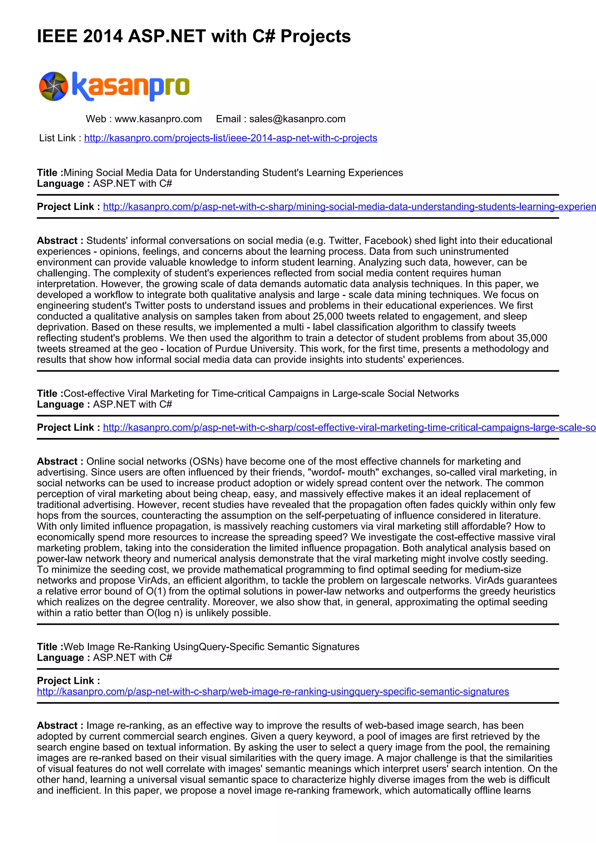 The document discusses multiple projects focused on leveraging social media data and enhancing web functionalities using ASP.NET with C#. One project develops a workflow to analyze student tweets for insights into educational experiences, while another explores cost-effective viral marketing in social networks, emphasizing the importance of optimal seeding strategies. Additionally, it presents an image re-ranking framework for improving web image search results by aligning visual features with semantic meanings.