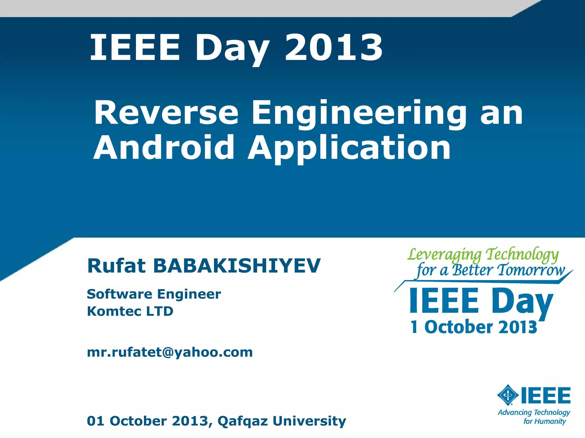 Rufat Babakishiyev will give a presentation on reverse engineering an Android application. The presentation will include an overview of reverse engineering and forensic research, a review of the Android OS architecture, an analysis of the Yahoo email client application, decompiling the application files and database, examining application artifacts after installation and uninstallation, and security best practices. The goal is to understand how the application stores and manages data and identify artifacts left behind after uninstall.