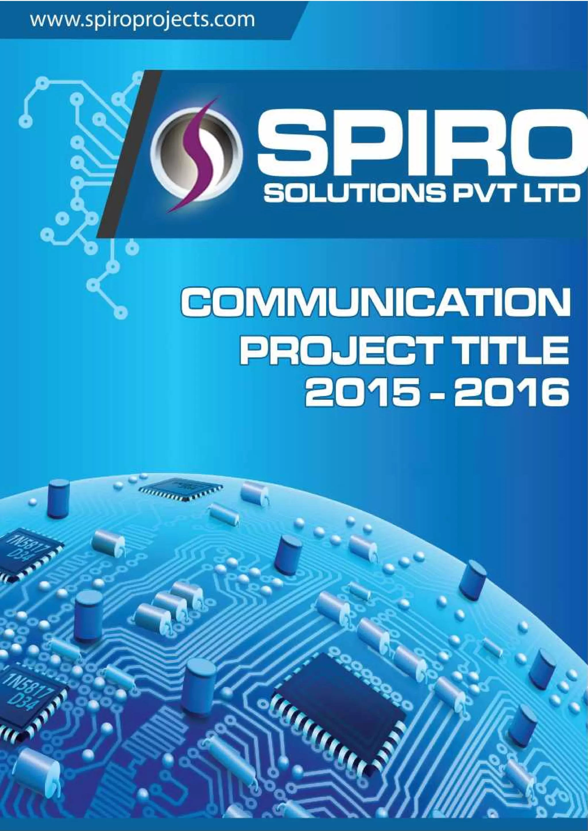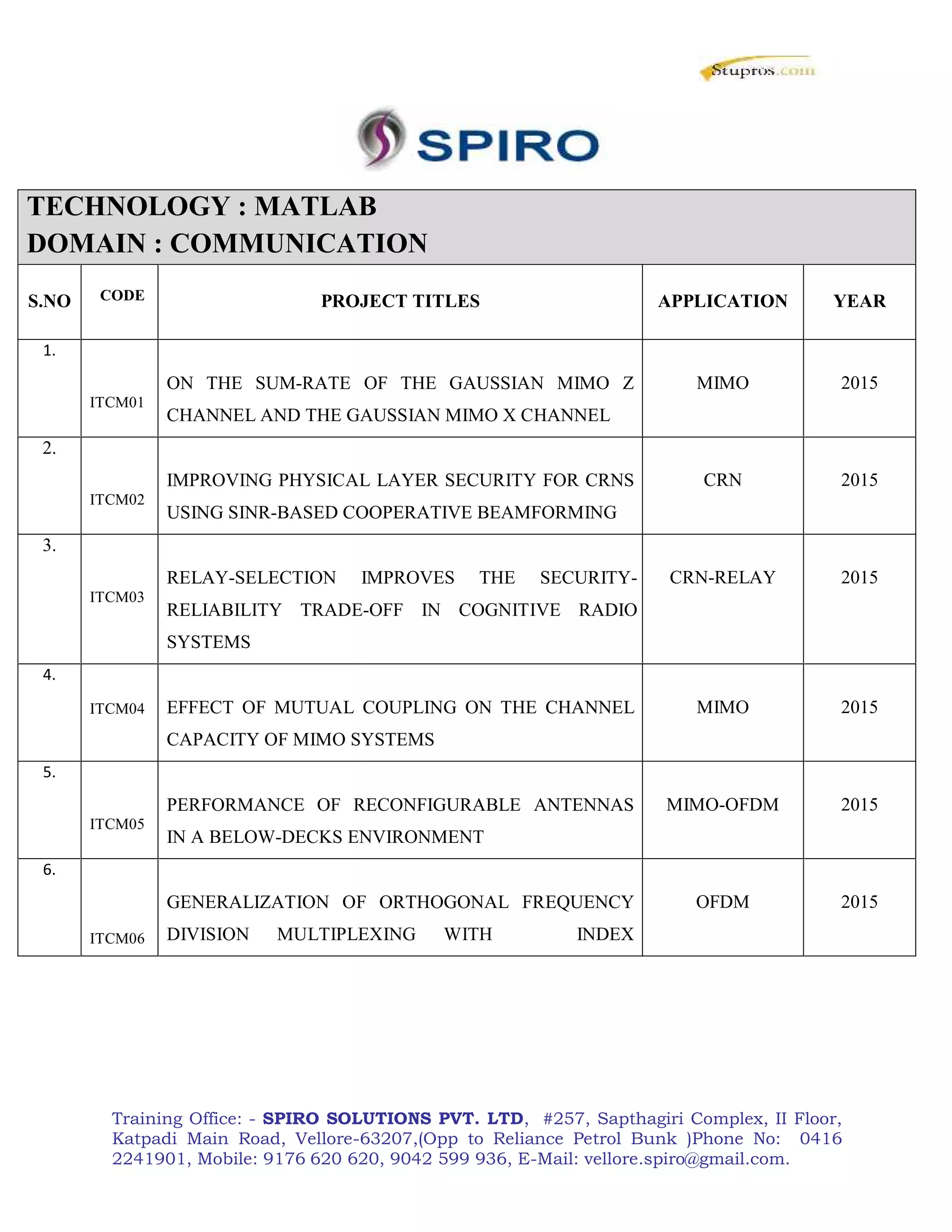 The document lists 20 projects related to communication and digital signal processing conducted between 2014-2015. It provides the contact information for Spiro Solutions Pvt. Ltd. in Vellore, India which conducted the training. Most projects focused on technologies like MIMO, OFDM, cognitive radio networks and relay networks to improve metrics like throughput, security and reliability in wireless systems. Example applications included 5G systems, radar and satellite communications.