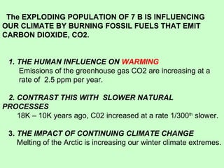 Human activities, particularly fossil fuel burning, are increasing CO2 levels at a rate 300 times faster than natural processes observed during the last ice age, contributing to climate change and global warming. The current CO2 concentration of 400 ppm is similar to levels from 8 million years ago, with projections estimating it could reach 1000 ppm by 2100. The rapid melting of polar ice is intensifying winter weather extremes and is expected to raise sea levels significantly, with human influence acknowledged as the dominant cause of observed warming since the mid-20th century.
