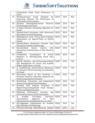 The document lists various research titles related to cloud computing published in IEEE Transactions on Cloud Computing between 2014 and 2015. It includes topics such as data access control, energy-efficient storage, scheduling algorithms, and privacy-preserving techniques for cloud environments. Each title is accompanied by a corresponding code, publication year, and month.