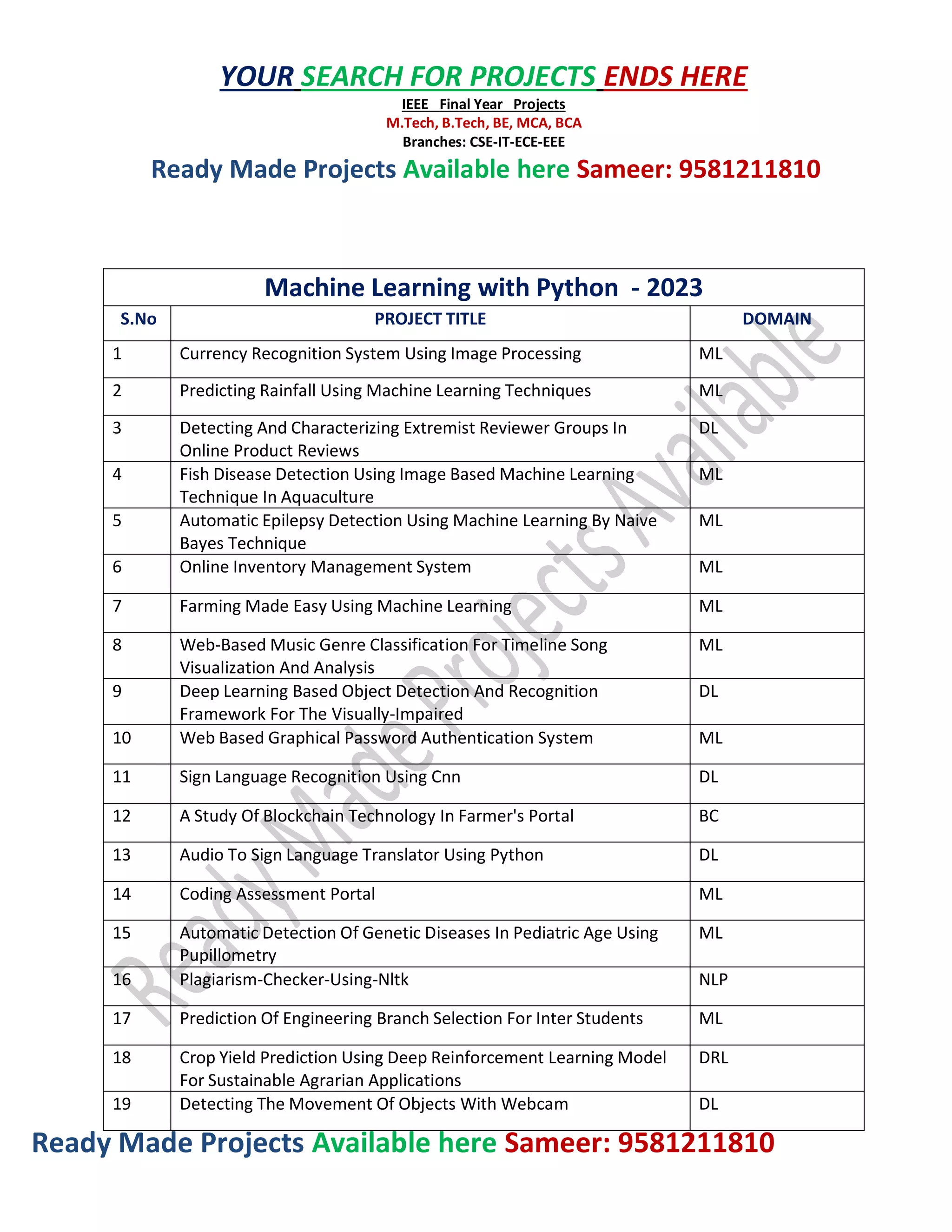 The document provides a comprehensive list of ready-made project topics in various domains such as machine learning, deep learning, and blockchain, available for students in fields like M.Tech, B.Tech, MCA, and BCA. Each project includes specific titles, focusing on applications ranging from healthcare and agriculture to cybersecurity and data analysis. Interested individuals can contact Sameer at the provided phone number for more information.