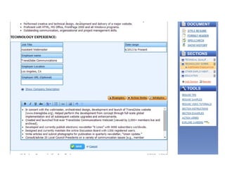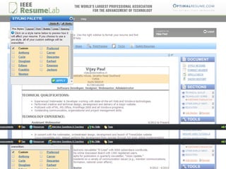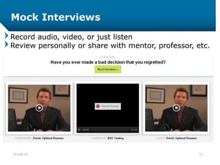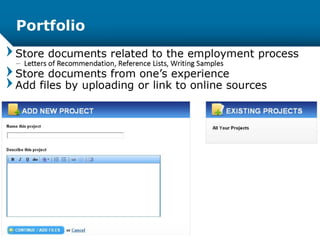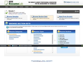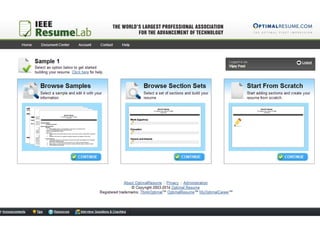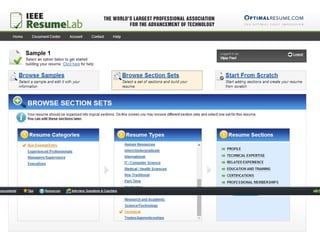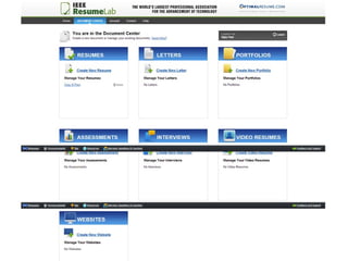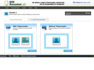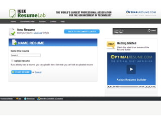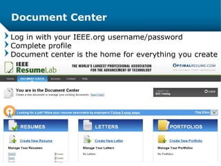 The document provides resources for job seekers, including resume building, cover letters, portfolio assessments, and mock interviews. It also highlights the availability of video resumes and a mentoring program. Access to these resources is facilitated through the IEEE website.