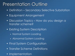 The document discusses the design of a transfer scheme for a secondary selective substation with two busses that can each be supplied by an incoming line circuit breaker, connected by a normally open bus tie breaker. It outlines the equipment arrangement, existing system loading conditions, and final configuration. Key aspects of designing the transfer scheme are discussed, including conditions for transfer, safety concerns, implementation methods, testing procedures, and maintenance. Logic diagrams of the main breaker and tie breaker are presented, showing how the transfer is initiated and blocked under various conditions.