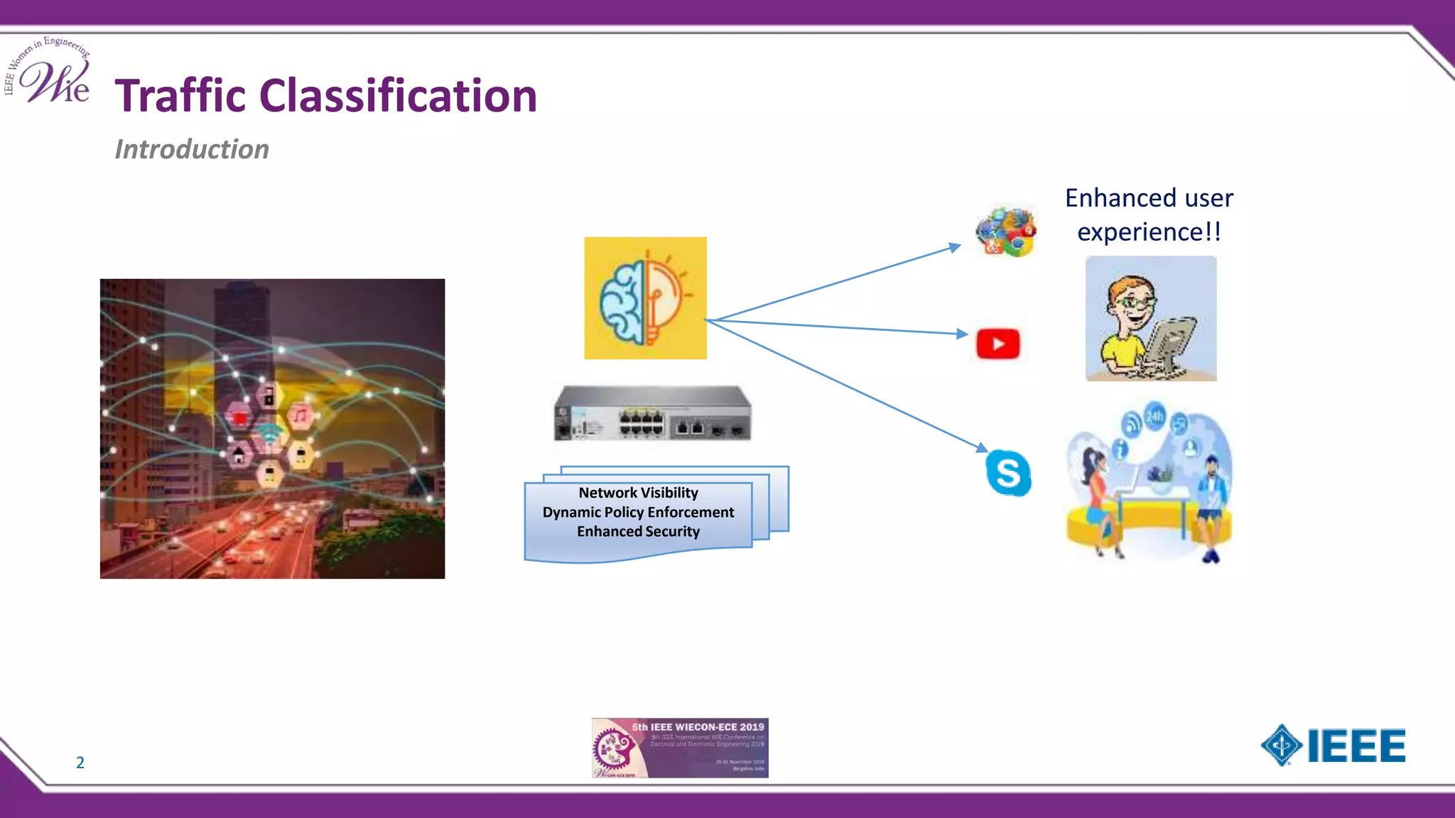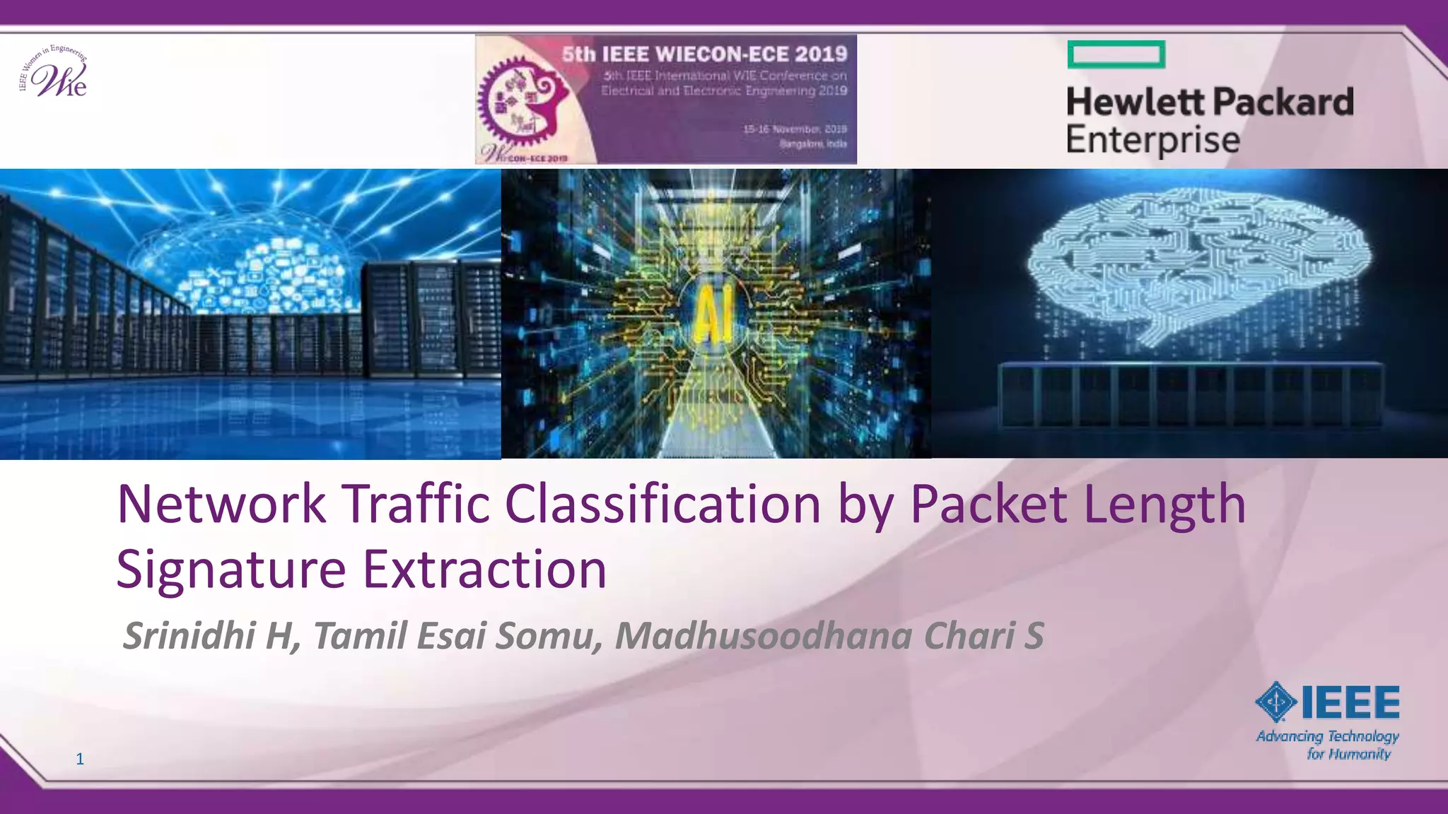 The document discusses a method for network traffic classification using packet length signatures to enhance security and user experience. It details data collection, feature engineering, and presents statistics on unique packet lengths across various protocols like VoIP, FTP, and web browsing. The document also outlines future expansions, including the use of the LZW compression algorithm and programming for ASIC integration.