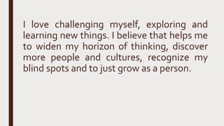 I love challenging myself by exploring new things, which helps me grow as a person. This is reflected in activities I've engaged in, such as street photography where I waited an hour to get the perfect shot of a priest randomly entering my frame. I also challenged myself by running for and winning the local presidency of AIESEC after two months of preparation. Attending an international youth conference in Poland where I interacted with delegates from over 100 countries was another amazing experience I worked hard to participate in, struggling to get my passport and visa.