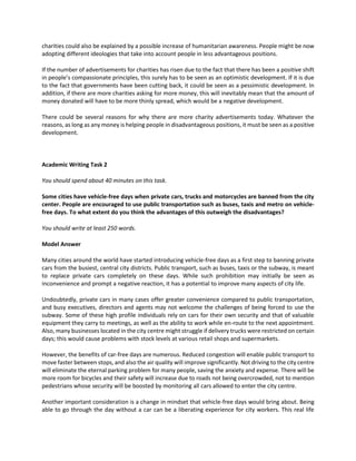 The document provides an overview of the IELTS examination, emphasizing its importance for those seeking overseas education and detailing its four sections: reading, listening, speaking, and writing. It discusses the writing task of the IELTS, giving examples of essay topics and the evaluation criteria focusing on English proficiency rather than the correctness of opinions. The document also addresses vehicle-free days in cities, highlighting both potential advantages, such as reduced congestion and improved air quality, and disadvantages related to reliance on private transportation.
