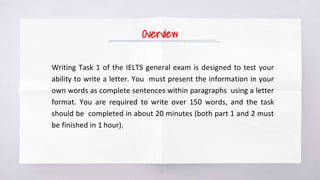 This document provides information about writing task 1 of the IELTS general exam. It discusses the requirements of the task, which include writing over 150 words in the form of a letter within 20 minutes. It outlines the criteria that will be assessed, including task achievement, coherence, vocabulary, grammar, and formality. It then gives examples of different letter purposes, such as requesting information, giving information, making a complaint, or thanking someone. Useful language for requesting information in a letter is also provided, along with a sample letter responding to a task asking to make hotel arrangements.