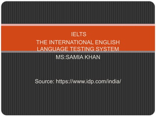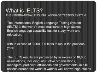 IELTS is the world's most popular English proficiency test for study, work, and immigration. It assesses all four language skills - listening, reading, writing, and speaking. Over 3 million tests are taken annually in over 140 countries. Test results are accepted by over 10,000 organizations worldwide, including educational institutions, employers, professional bodies, and governments. IELTS is taken on either paper or computer and tests a variety of language skills, including reading for detail, meaning, and arguments. It is widely accepted for study at universities and immigration to countries like Australia, Canada, the UK, and others.