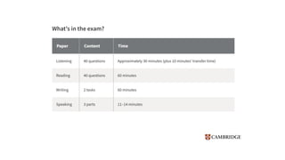 The document provides information about the IELTS Reading Test, including its purpose, format, question types, and skills assessed. The test contains three sections of increasing difficulty and covers everyday topics, work-related topics, and longer general interest texts. It assesses understanding of main ideas and specific details through multiple choice, true/false, matching, and short answer questions. Test takers must transfer their answers during the allotted time and spelling and grammar affect scoring.
