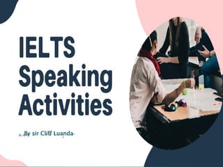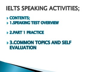 The document provides guidance on the IELTS speaking test. It notes that the test has 3 sections which takes 11-14 minutes, and is scored based on fluency, grammar, vocabulary, and pronunciation. It describes the structure of the test sections - an introduction, followed by 3 topics each with 3-4 questions. Examiners will ask basic identification questions and then move to topics like hobbies, home, and work. For the final section, test takers receive a cue card and must speak about the topic for 1-2 minutes. The document provides examples of cue card topics and vocabulary to use for a high score.