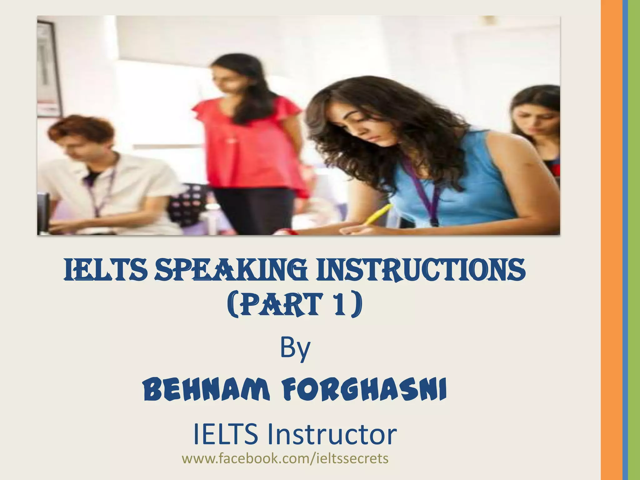 The document provides instructions for the IELTS speaking exam, emphasizing the importance of clear communication, avoiding informal language, and not using difficult words unless confident. It advises against memorizing answers and encourages speaking relevantly to topics during the exam. Additionally, it suggests practicing with an instructor or a friend to prepare effectively.
