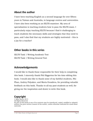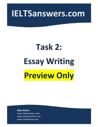 The document is a guide for teaching IELTS writing skills, specifically focused on Task 2, which requires students to write an academic-style essay. It outlines the author's experience as an ESL teacher and examiner, and discusses the types of essay questions that can be encountered in the IELTS writing exam, along with strategies for structuring and planning responses. Additionally, it provides tips on addressing common mistakes, improving vocabulary, and enhancing overall writing skills to achieve better exam results.