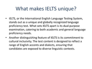IELTS, or the International English Language Testing System, is a globally recognized test that assesses English language proficiency for both academic and general purposes, featuring content that reflects diverse linguistic contexts. The test evaluates listening, reading, writing, and speaking skills, and is administered by the British Council, IDP Education, and Cambridge Assessment English. Candidates can choose between IELTS Academic and IELTS General Training, depending on their needs for academic or practical English language assessment.