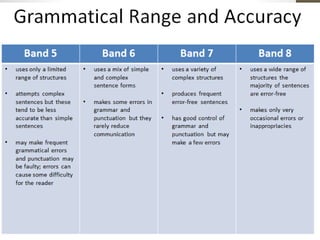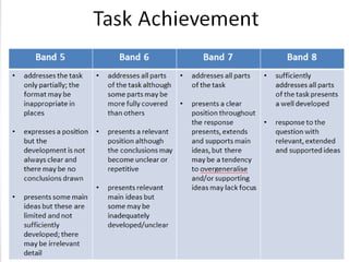 The IELTS writing band descriptors evaluate candidates on four main criteria: task achievement, coherence and cohesion, lexical resource, and grammar, each contributing to 25% of the total score. Differences exist between Task 1 and Task 2, particularly in requirements for word count, structure, and depth of response, with Task 2 necessitating clear argumentation and examples. Proper use of vocabulary, grammar variety, and adherence to academic tone are crucial for achieving higher band scores.
