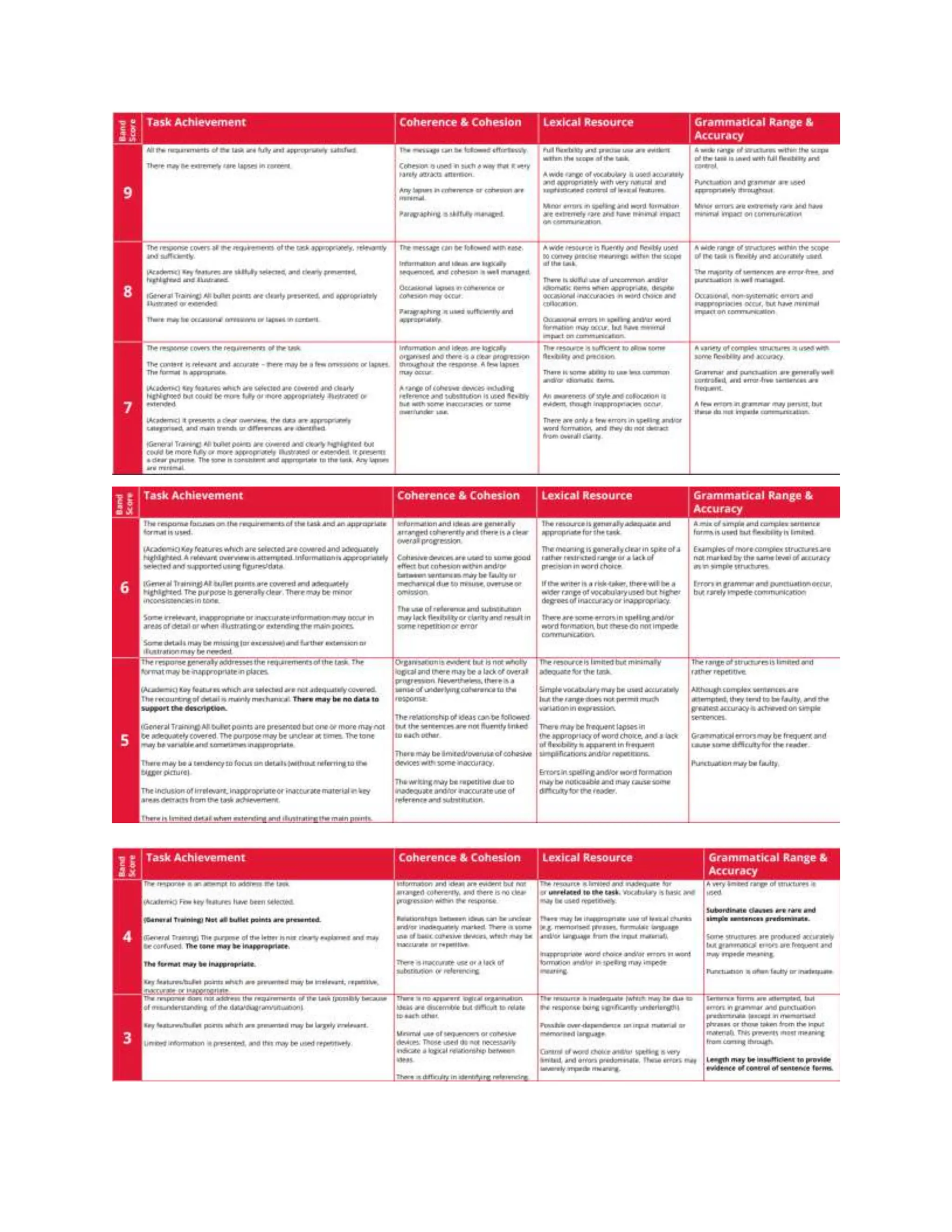 The document outlines a grading rubric for evaluating written responses across four main criteria: task achievement, coherence and cohesion, lexical resource, and grammatical range and accuracy, each ranging from scores of 4 to 9. It details the required characteristics for various scoring levels, emphasizing elements such as relevance, clarity, organization, vocabulary usage, and grammatical control. Each category provides specifics regarding what is expected at different performance levels, guiding evaluators in assessing written work effectively.