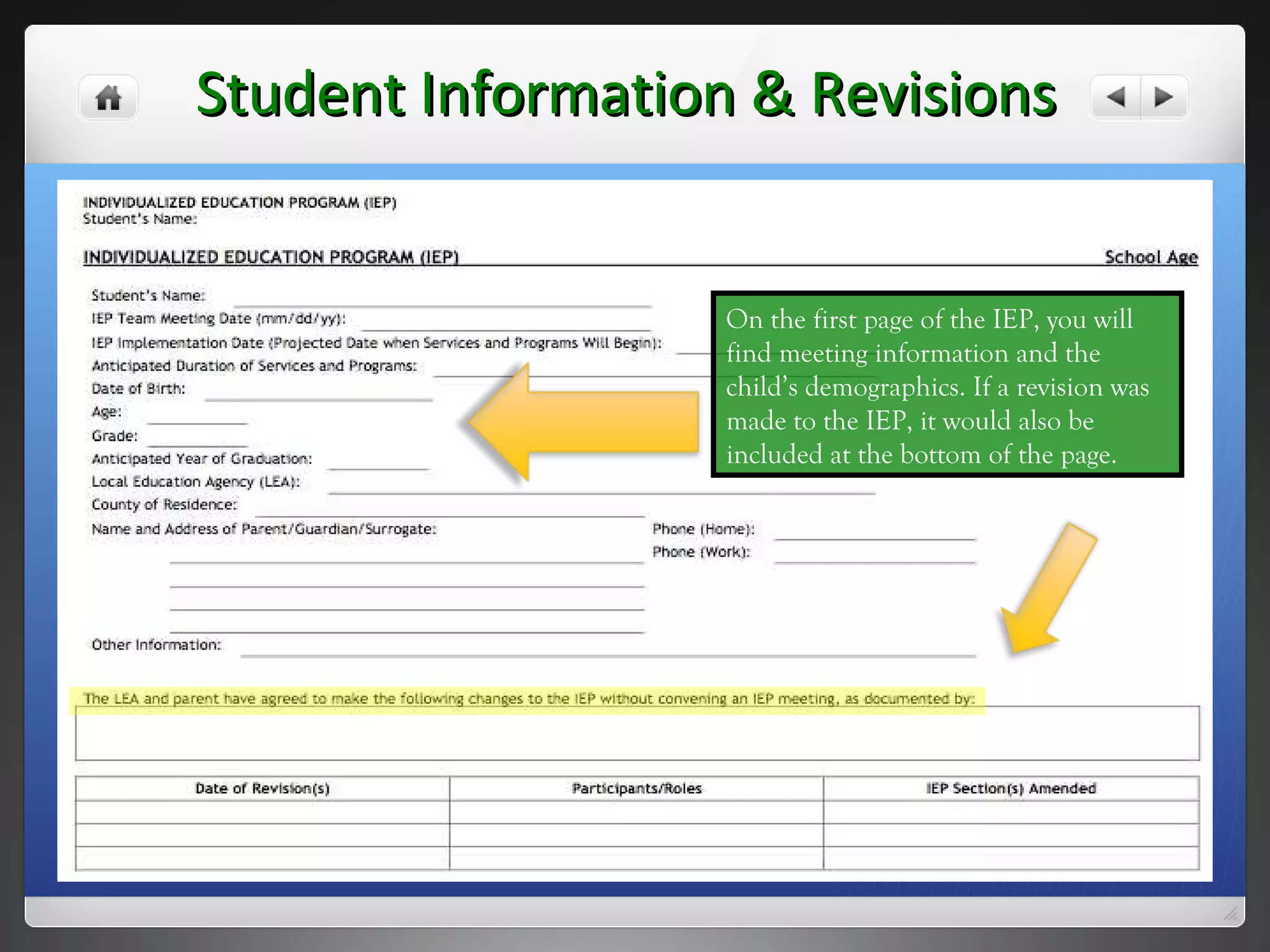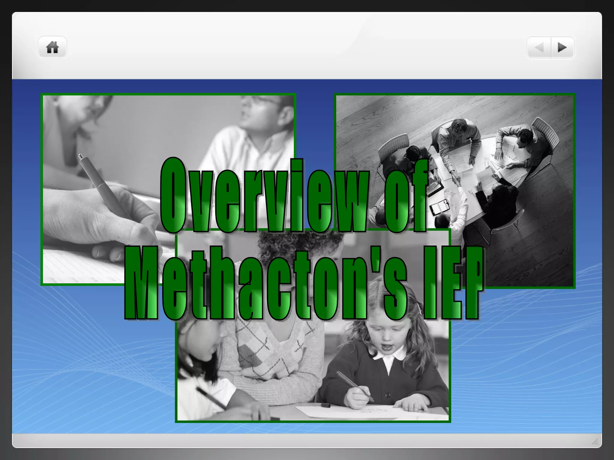 The document provides an overview of the sections contained in Methacton's Individualized Education Program (IEP). The IEP includes sections for student information and revisions, team signatures, procedural safeguards, special considerations, present levels of performance, transition services, participation in assessments, goals and objectives, related services and modifications, extended school year services, educational placement, and service hours. Each section addresses specific components that must be considered and documented in a student's IEP.
