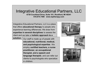 Integrative Educational Partners, LLC is an educational therapy practice located in Rockford, Michigan that offers services to people experiencing learning differences. They take a holistic approach using experts from various disciplines like education, nutrition, medicine, and psychology. Services include assessments, individualized therapeutic plans, and therapies targeting skills like motor planning, sensory processing, academics, and more using a multi-sensory approach. Typical sessions include activities to address neurological deficits and facilitate communication between the brain and body.