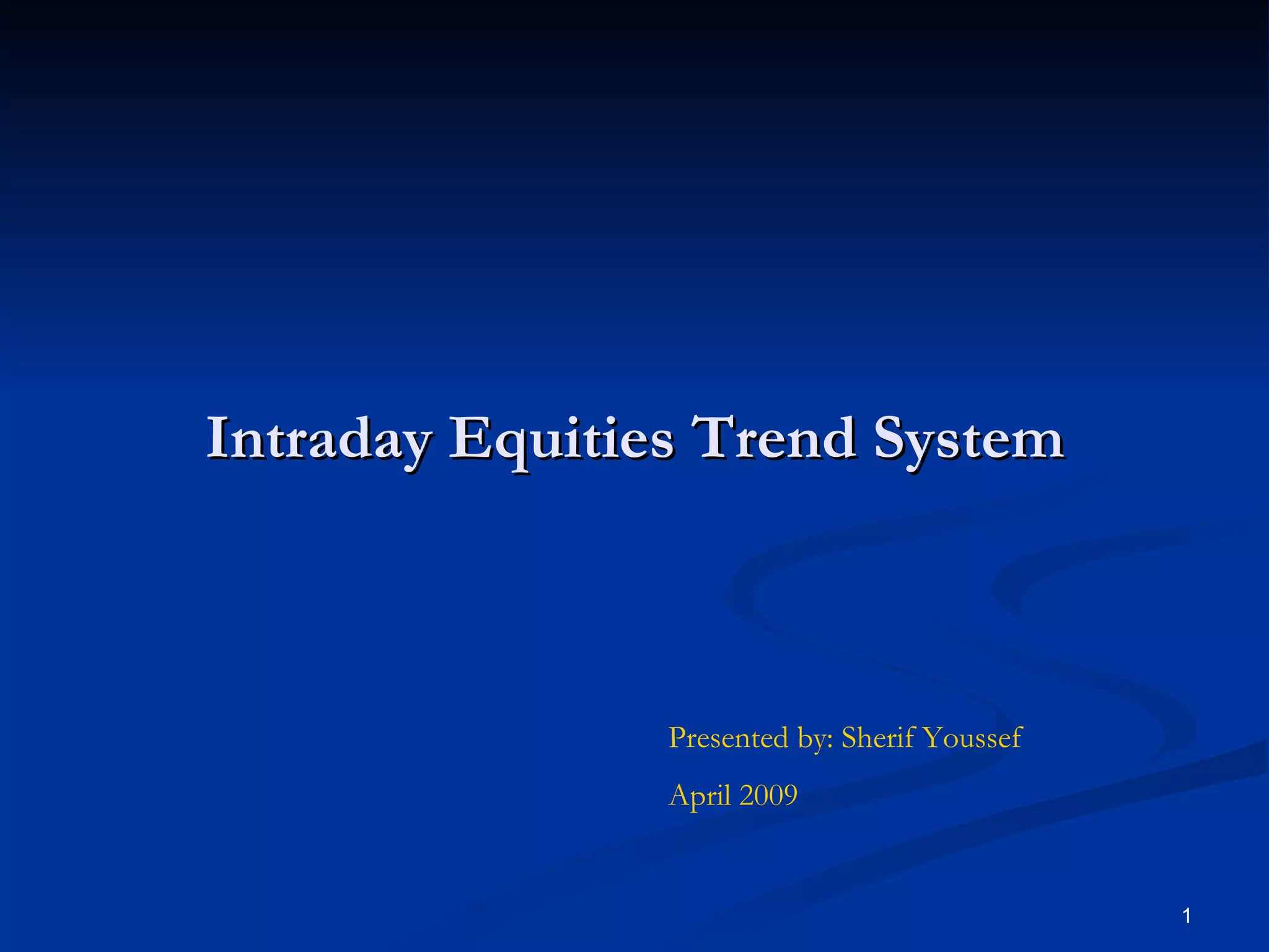 The document describes an intraday equities trend system that aims to identify liquid stocks exhibiting volatility and momentum for short-term trading. The system uses a proprietary technique to select stocks in a favorable "volatility and liquidity sweet spot" and takes long positions in strong stocks and short positions in weak stocks. Hypothetical backtested performance from 2007-2008 showed gains of 9% in high volatility periods and losses of 5% in low volatility periods, with the strategy aiming to return 15-20% annually while limiting drawdowns.