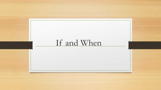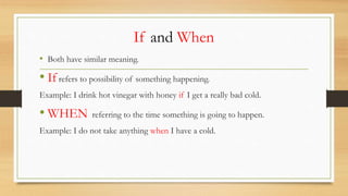 This document discusses the difference between the words "if" and "when" and provides examples of their usage. "If" refers to possibility, while "when" refers to time. Some examples are given such as "I drink hot vinegar with honey if I get a really bad cold" and "I do not take anything when I have a cold." The document then provides more examples of using "if" and "when" in sentences about common illnesses and situations. Students are assigned an activity where they write sentences using "if" and "when" about what they do when sick and ask classmates questions using "if" about what they would do in certain situations.