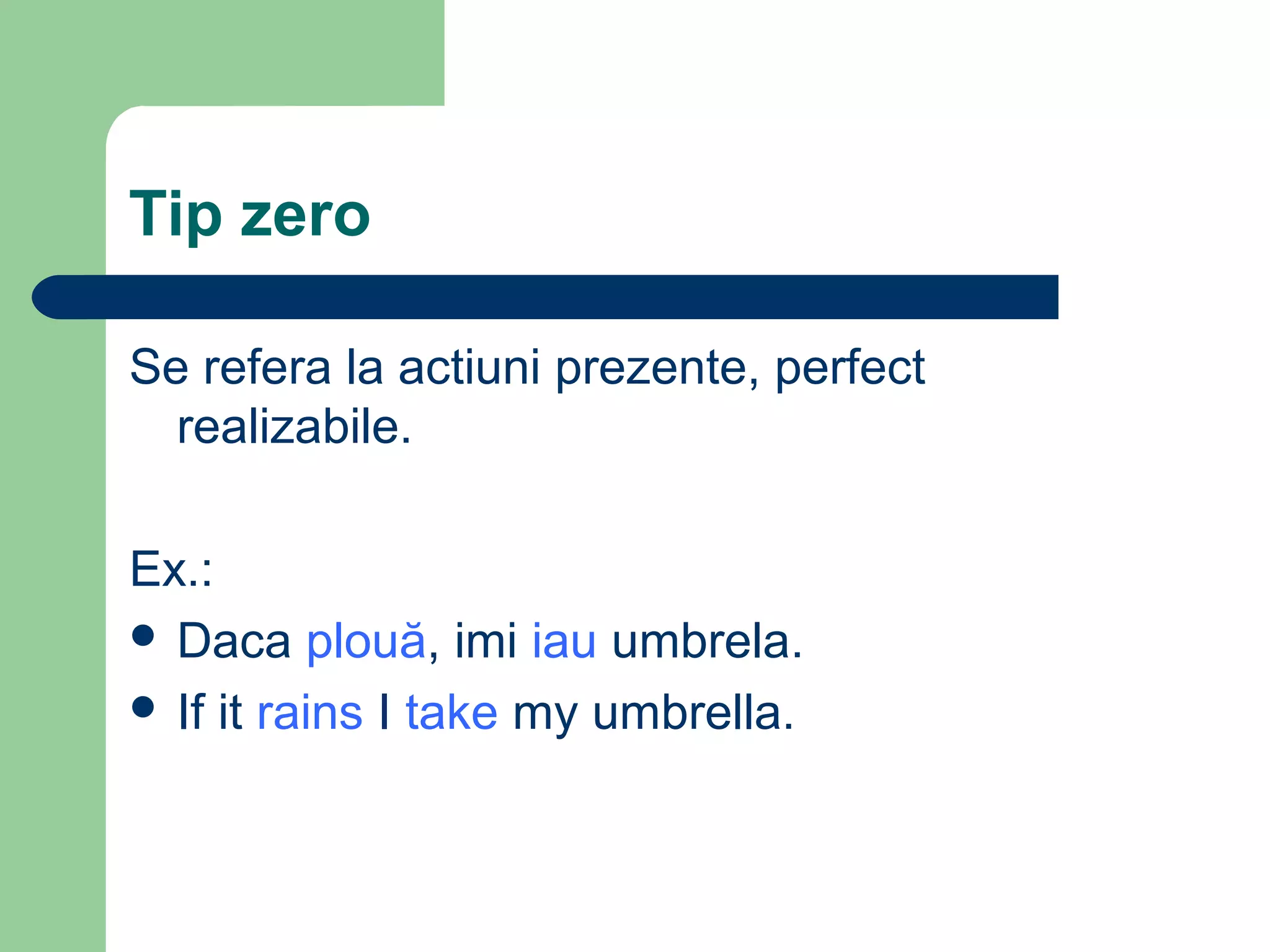 The document discusses different types of conditional clauses in English. There are three main types: