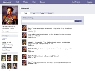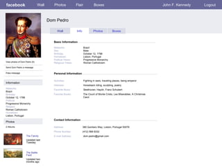 3) Additional details from Dom Pedro's profile provide personal information about his background, interests, family, and contact details.