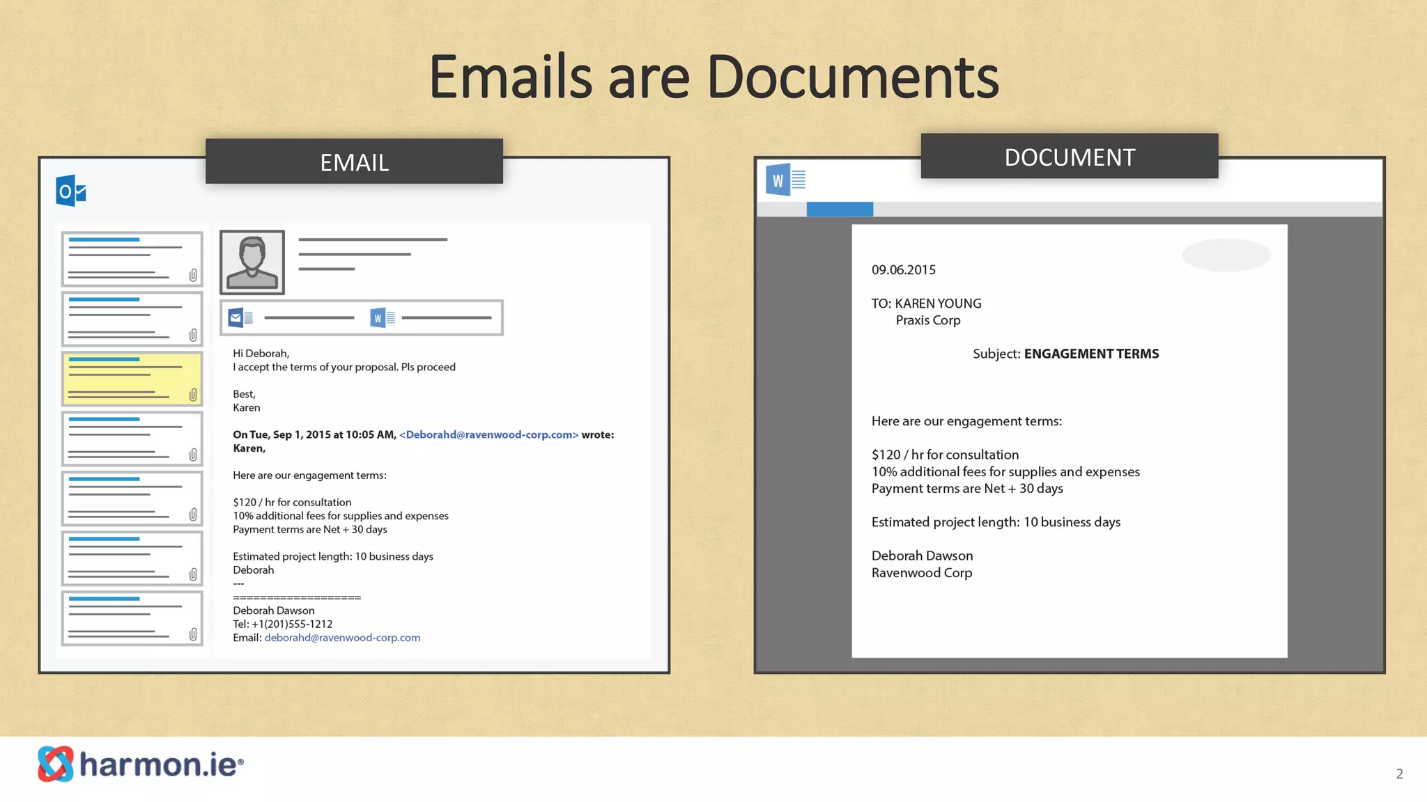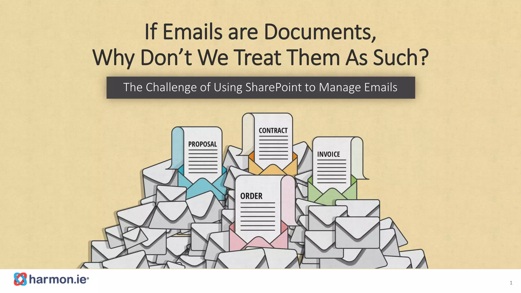 The document discusses the challenges of managing emails within SharePoint, highlighting a gap between email storage in Exchange and document management in SharePoint. It presents harmon.ie as a solution to allow users to store, classify, retrieve, and collaborate on email messages directly within SharePoint, thereby enhancing productivity and reducing email chaos. The proposed integration ensures better management of records, projects, and knowledge retention.