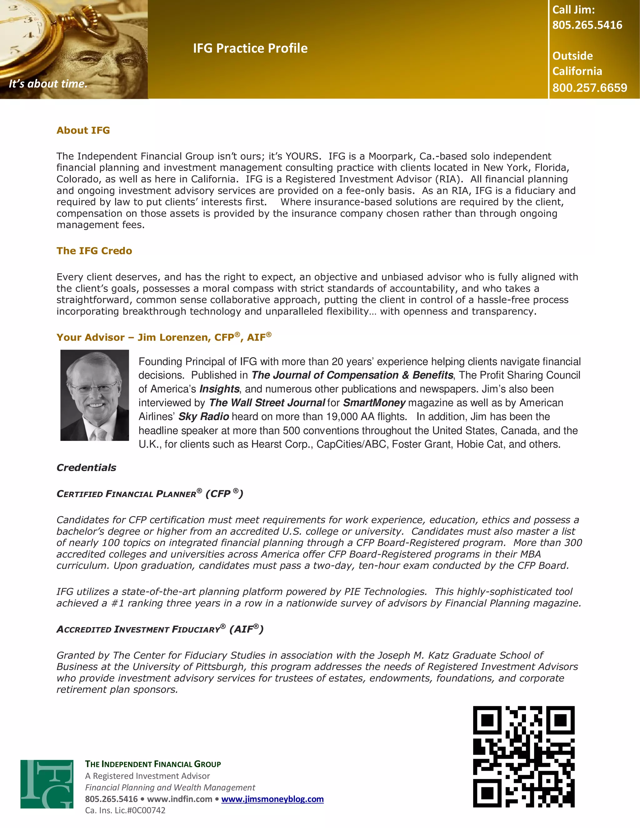The Independent Financial Group (IFG) is a fee-only registered investment advisor located in Moorpark, California that provides financial planning and investment management services. IFG is led by Jim Lorenzen, a Certified Financial Planner and Accredited Investment Fiduciary with over 20 years of experience. IFG utilizes sophisticated planning software and partners with custodian Pershing to provide independent fiduciary services focused on helping clients achieve their financial goals.