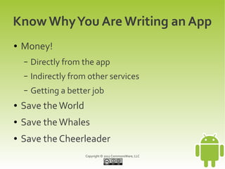 This document provides tips for developing Android apps. It recommends identifying your target market and how you will monetize your app. It suggests choosing screen sizes to target like phones or tablets. It also recommends using fragments and action bars, following UI patterns, and getting help if needed. The overall message is to plan your app thoroughly before developing it.