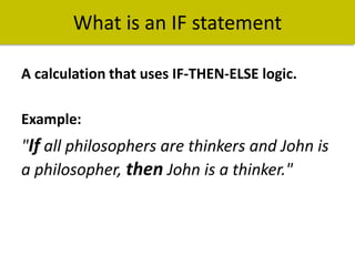 The IF function in Excel allows you to write conditional logic in a cell. It has the following structure: =IF(logical_test, value_if_true, value_if_false) The logical_test is a cell reference, value, or formula that evaluates to True or False. If true, it returns the value_if_true. If false, it returns the value_if_false. Examples show using IF statements to check cell values and return text like "Correct" or "Incorrect" depending on the outcome of the logical test.