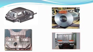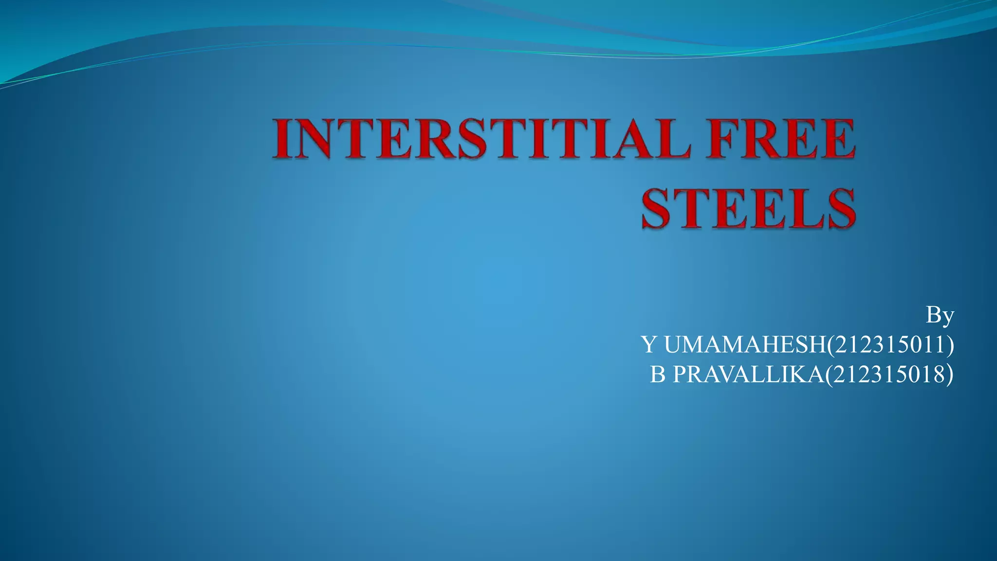 Interstitial free (IF) steels were developed in Japan in 1970. They contain very low amounts of carbon (below 30 ppm) due to the addition of stabilizing elements like titanium and niobium that form carbides. This allows for high plasticity and formability. IF steels are used in automotive body parts and deep drawn household appliances due to their low yield strength to tensile strength ratio and ability to be deeply drawn. They are produced through vacuum degassing and stabilization to remove interstitial atoms from the iron lattice.