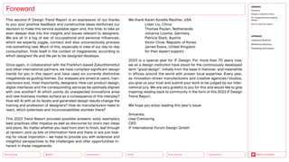 The 2023 IF Design Trend Report explores six megatrends shaping contemporary design: connectivity, silver society, health, urbanization, mobility, and neo-ecology, examining their impacts on product design and digital interfaces. This comprehensive analysis is aimed at designers, manufacturers, and users, providing insights into innovative strategies and solutions that respond to societal challenges. With a focus on the interplay between real and digital worlds, the report emphasizes the need for design that balances connectivity and disconnectivity, facilitating a holistic understanding of emerging trends.