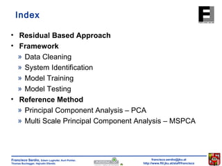 This document discusses a data-driven framework for condition monitoring at rolling mills using a residual-based approach for fault detection. It outlines the methodology, including data cleaning, system identification, and model training, and compares its performance with traditional methods like principal component analysis (PCA) and multi-scale PCA (MSPCA). The findings indicate that while PCA can be more effective, the proposed residual-based method shows promise, especially when accounting for non-linearities.