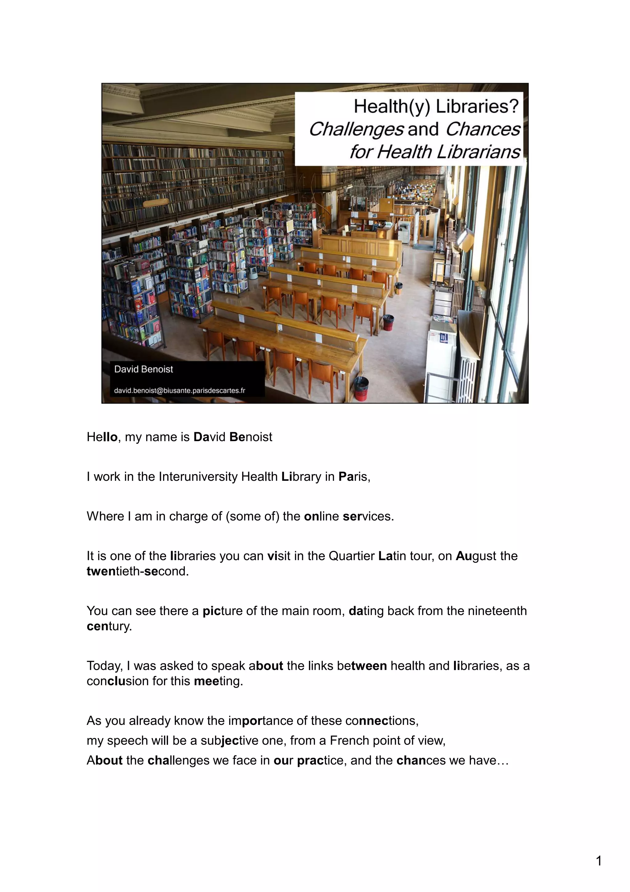 David Benoist works at the Interuniversity Health Library in Paris where he manages online services. He discusses the challenges facing health librarians, including increased amounts of data and publications, tighter budgets, and questions around the future of health libraries and librarians. However, he argues that librarians are still needed to help patrons navigate this complex information landscape and that libraries must adapt by developing new skills to remain relevant.